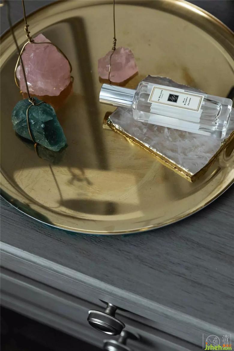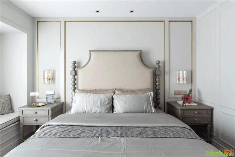 整个主卧室素雅安静,局部使用了护墙板加金属线条,增加空间的精致感。