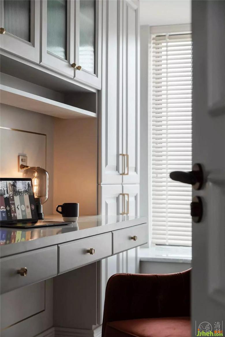 和主卧室相呼应的护墙板加金属元素贯穿书房,强大的收纳功能无处不在。