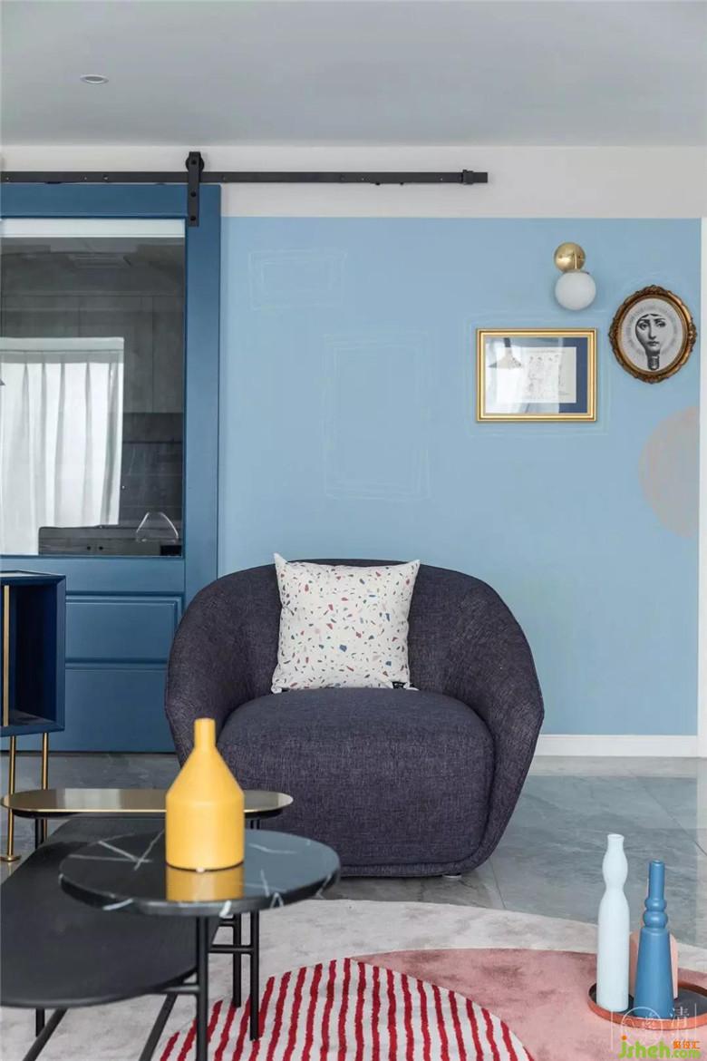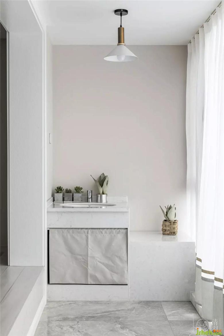 与客厅相连的休闲阳台,我们为业主布置了洗手台和花台,方便业主打理植物和浇花。阳台的另一头,是为这个家容纳杂物而设置的储物柜。