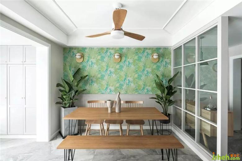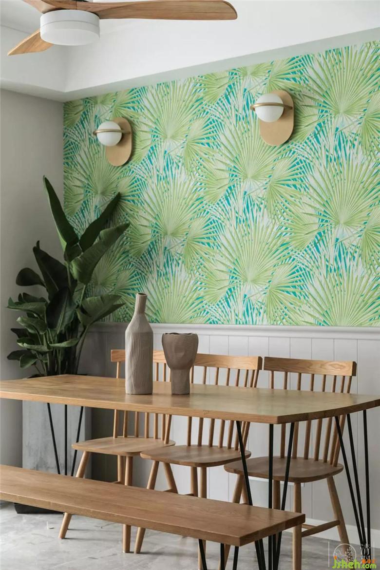 植物背景的墙纸和原木色的餐桌椅、风扇灯让餐厅的氛围轻松愉悦。
