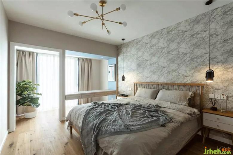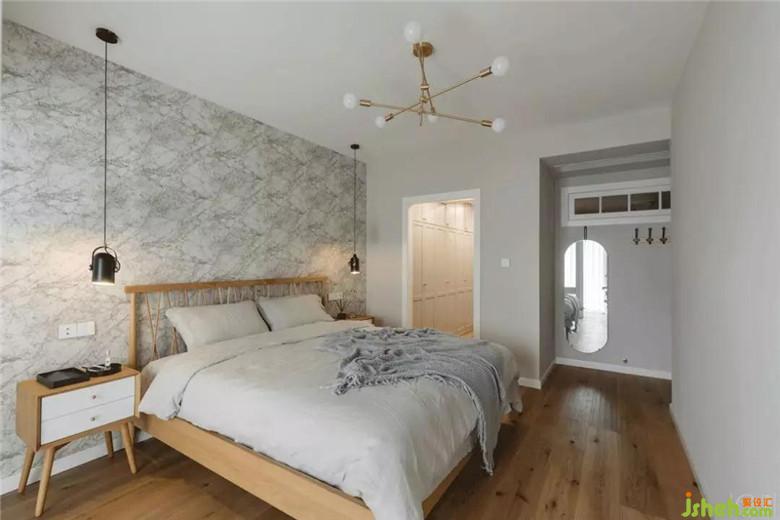 白色大理石纹墙纸和原木色的床、朴质的亚麻床品构成了主卧室的自然格调。
