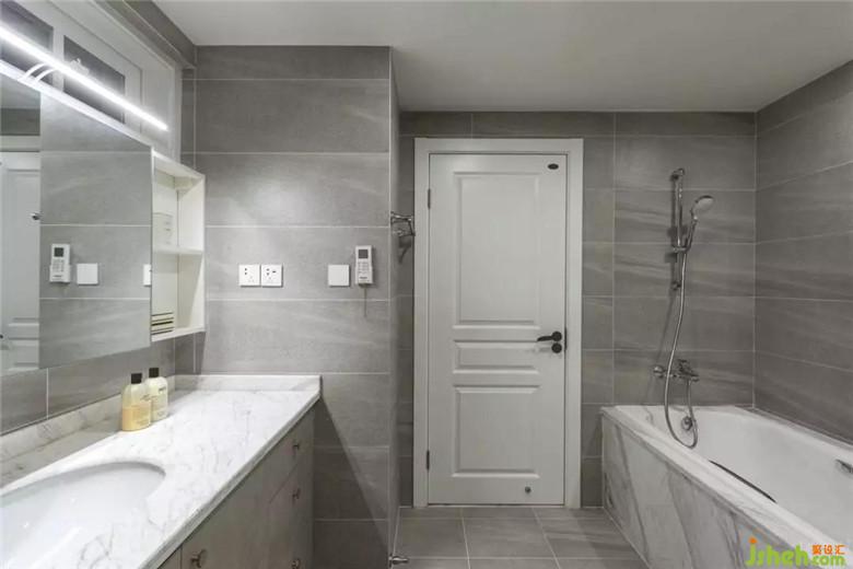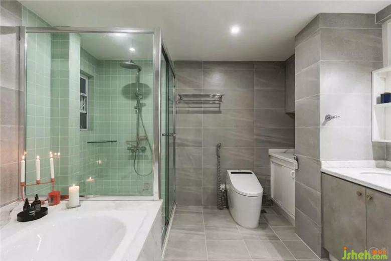 宽阔的主卫方便好用,收纳储物空间也很充足。大面积灰色的墙砖里用薄荷绿小方砖作为点缀。
