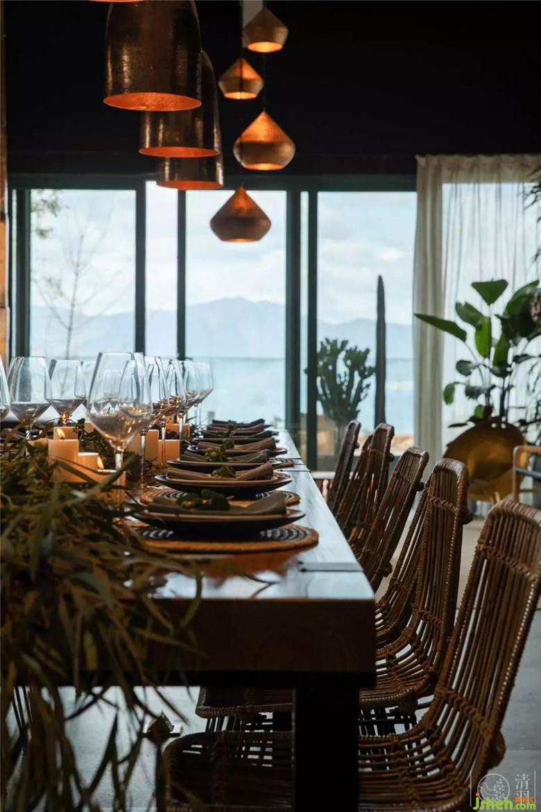餐厅,同样是开放式,并且采用了西式长条桌,没有做单独的分桌。一来方便聚会,二来也给陌生的旅人间创造更多的可能。