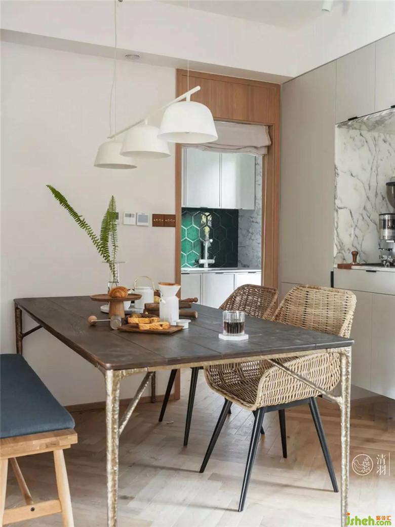 餐厅作为客厅的一部分,我们没有做特殊的处理。将冰箱彻底隐身在餐桌后的墙体中(内嵌式料理台左侧),节省空间的也消除大电器在自然系空间氛围中的违和感,摆放上带点粗矿感的英国Square roots橡木铁艺餐桌,壹集藤编餐椅和布艺原木的双人条凳,原藤原木搭配深褐色,大概一眼就能让人联想到东南亚的海边餐厅吧。