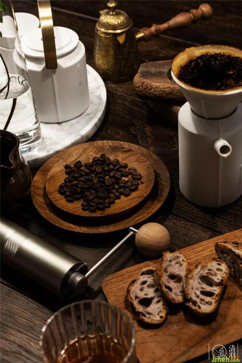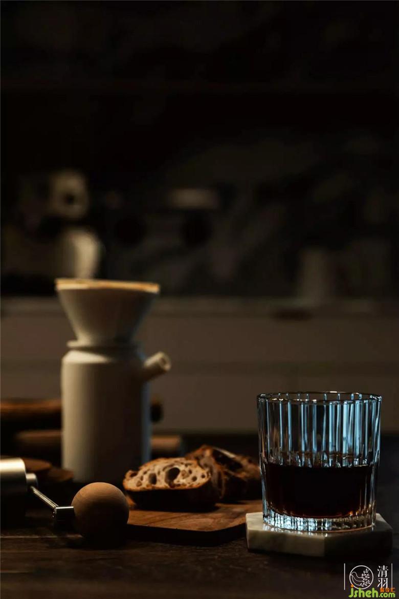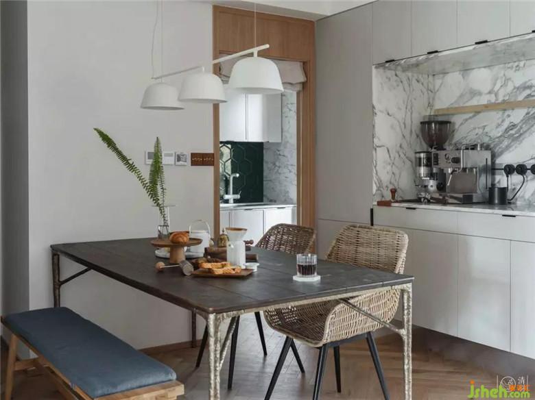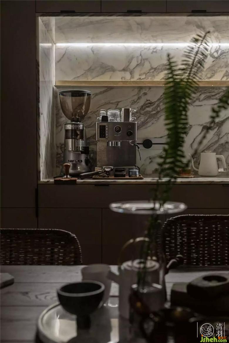 餐桌背后与厨房衔接的墙面,切割出一个嵌入式料理台,前卫而实用。放置上常用的咖啡机、手冲壶,方便日常使用的同时也再次强调了整个空间的“轻松休闲”感。