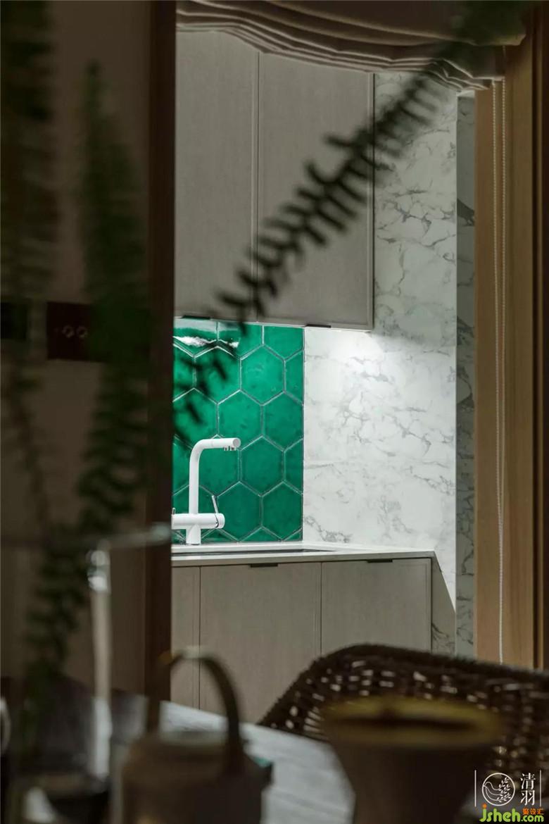 由餐桌看过去的一抹绿,便是厨房的点睛之处了。