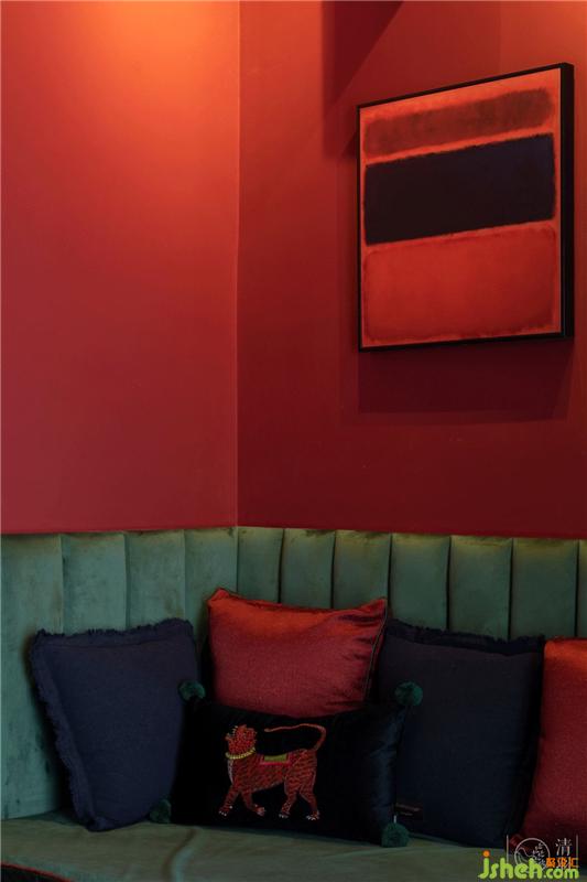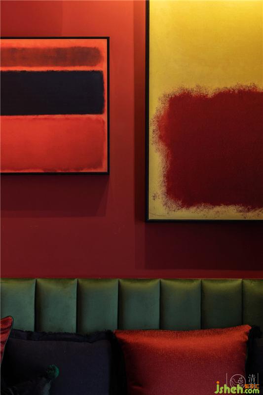 一大一小两幅罗斯科的抽象色块画,在色彩和视觉张力上呼应了沙发与背景墙的颜色。背景墙的射灯色彩和照射角度也有意制造出梦幻温暖的感觉。别致的老虎刺绣抱枕和红色丝绸抱枕混搭,中和了浓烈色彩的碰撞,复古又摩登。