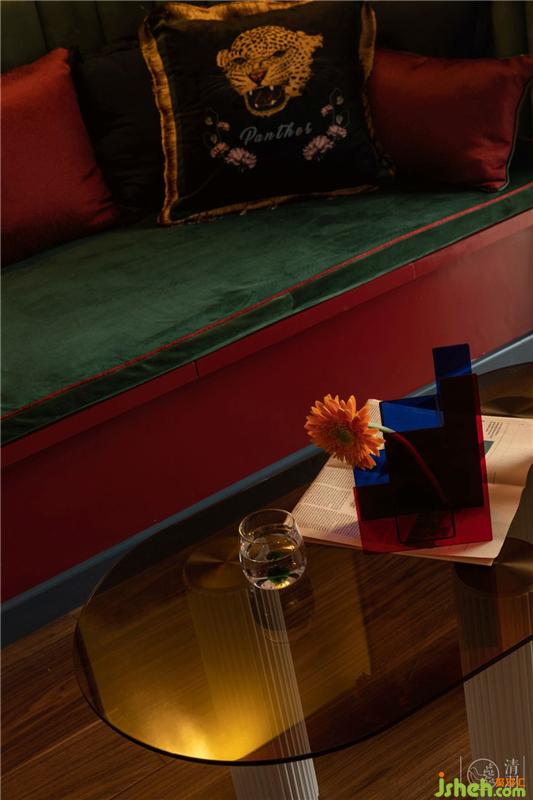 沙发也是我们现场制作的,靠墙卡座的造型,绝对意义上优化了原本窄小的客厅。材质特意选择了丝绒面料,橄榄绿与饱和度极高的橙红色墙面碰撞出极致的视觉冲击,迷幻感十足。
