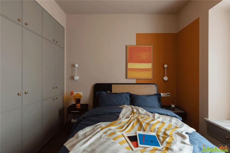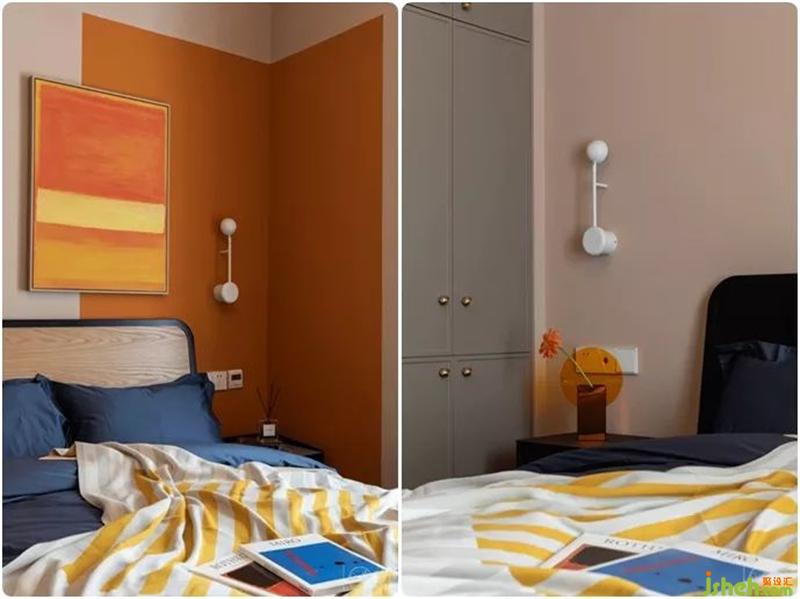 主卧依然多彩,但温柔了许多,马蒂斯的温柔色块在这里只做部分切割,柔和活力的橙只在转角之间刷了一块,留白更多,灰绿色的衣柜面板和极具包豪斯美感的黑边木纹床头呼应,营造出卧室舒适、放松的氛围。