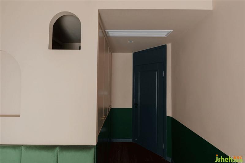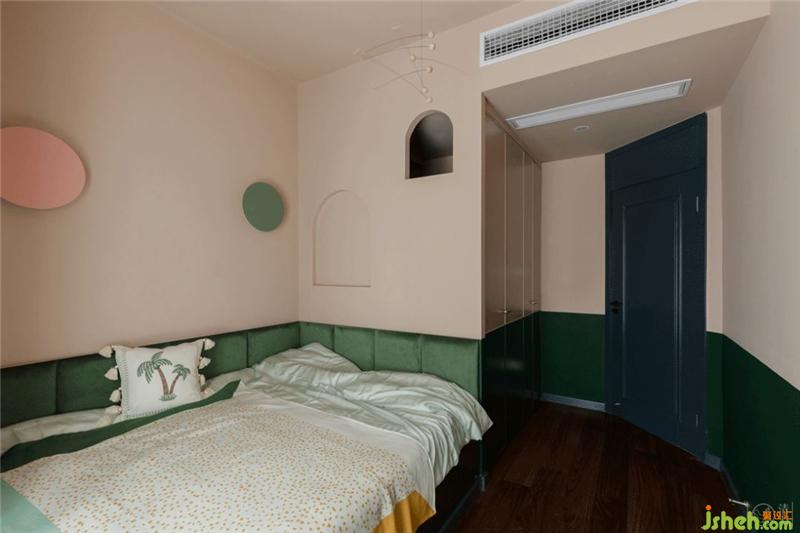 次卧的墙面被切了个角以后,进门的样子就显得格外有趣啦,于是这个房间就全是满满的童趣。装修设计
