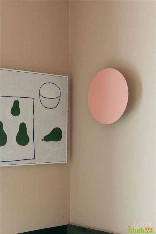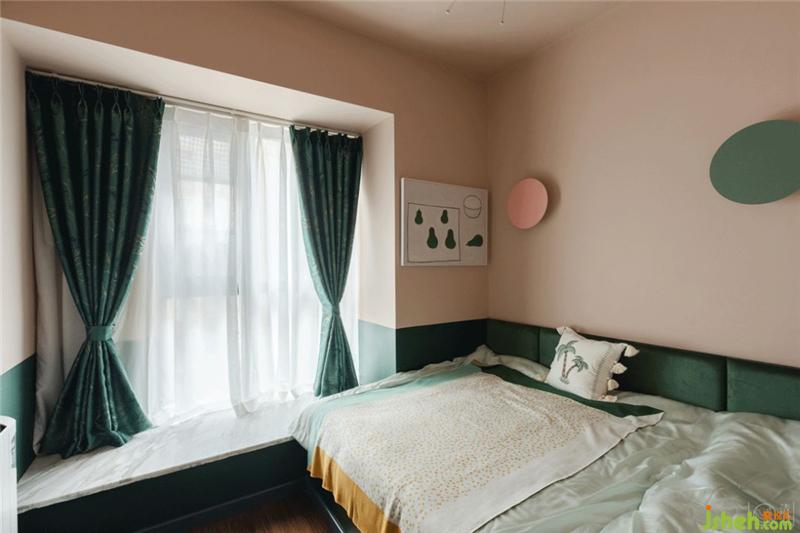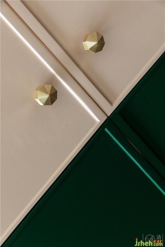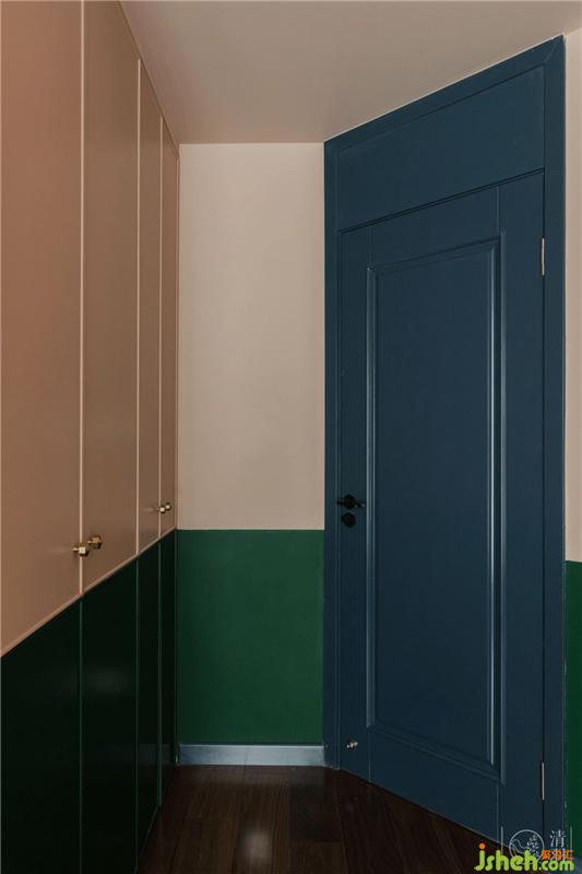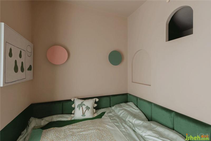 浅到最浅的粉和深到很深的绿会碰撞出最柔情的世界,粉色的乳胶漆连同衣帽间柜子的颜色做了无限的接近,而半墙的墨绿色丝绒软包也和墙面乳胶漆无限统一,开了拱形洞的衣帽间让这个房间变成了森林里的树屋,充满童趣。
