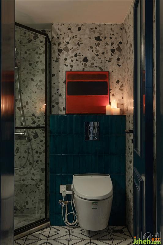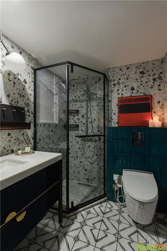 淋浴间做了钻石型淋浴隔断,很好的利用了转角的位置。墙面是仿水磨石瓷砖,星星点点的纹理浪漫而别致。