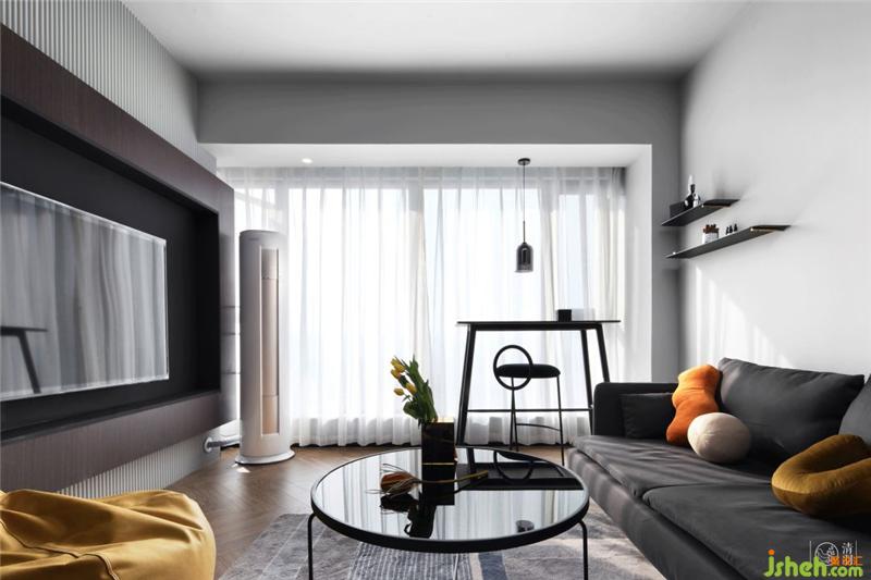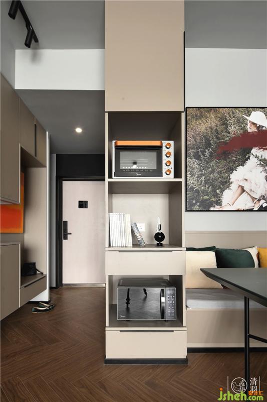 从入户到客厅,总体以大面积的灰色调为主,从墙面到顶面的浅灰色,衍生到地板的黄棕色,再到贴墙而建的储物柜的暖灰,大体以三个浅灰色调将客厅的空间合理的划分开。最后在大面积的浅灰色调中,巧妙地采用家具自带的重色和灯具的金属黄、纱窗的白等跳色,将整个空间变得沉稳又不失生动。多个色调,在统一中追求不同,将整个空间的格局变得既简单又丰富,既平凡又高级,既理性又生动,丝毫不显得单一和无聊。室内设计师