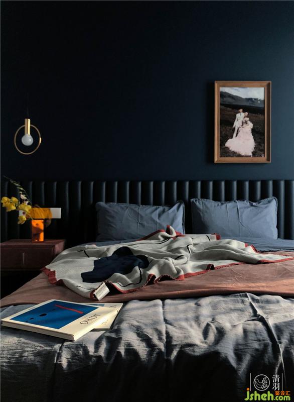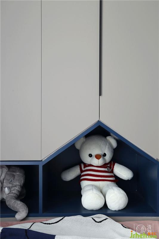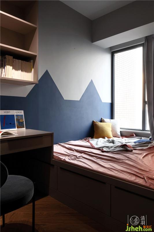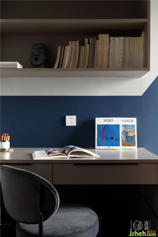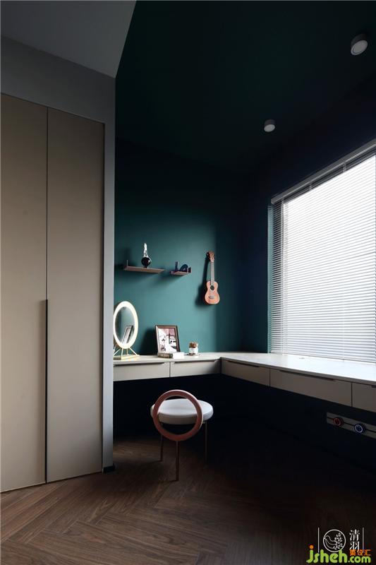 从客厅走向书房,主人公喜欢安静,所以我们采用木质家具的浅棕色、米白色和墙面局部的墨绿色相互搭配融合,简简单单的几个色调,加上家具的一字型和L字型,再节约空间的基础上增加储存容量,也将把整个空间的狭小、方寸之感拉伸,增加空间功能性。