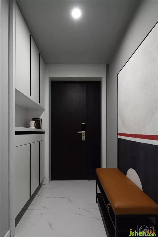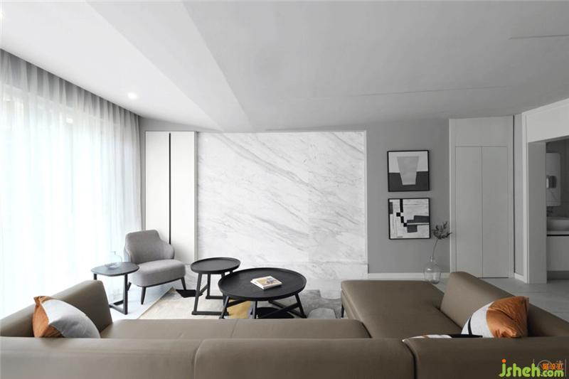 通过玄关进入室内空间向右是厨房,向左是客厅。客厅整体空间以白色主色调。灰色墙漆、白色大理石、白色系家具都围绕它展开。以浅灰色沙发、灰色电视背景墙为次色调,用白和灰两大色调,将整个空间完美切割,打造一个既简洁,又通透的空间。