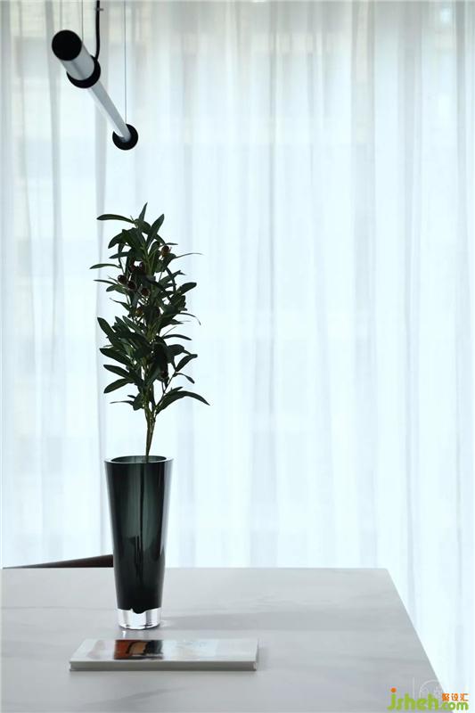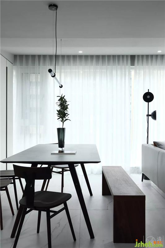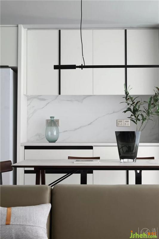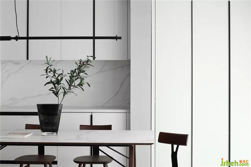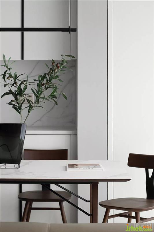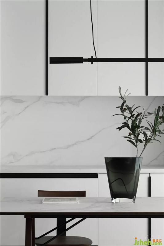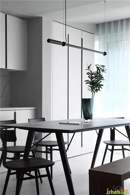 开放式的空间布局,使客厅和餐厅两个空间之间相互贯通、相互融合。餐厅里我们用白色橱柜将空间进行延伸,用木质的餐桌座椅以及家具拉手的黑色线条去缓解了空间里大面积白色带来的清冷感,也将客厅与餐厅有效的进行了融合。