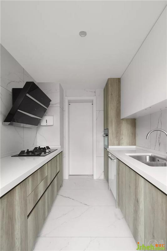 中西文化多种多样,东方传统文化与西方现代文化各自独立又兼容并蓄。所以在饮食上,考虑到中餐和西餐的做法不一致,厨房的空间有限,我们将中厨区独立设计,中西厨区分属为两个阵营,中厨区继续沿用客厅风格,整体以白色、木色为主,用黑色拉手、黑色家电点缀其间,彰显着空间简单大方的空间氛围,并且在空间两侧采用一字型的操作台,有效的将操作空间进行了合理划分,最大限度增加了厨房的收纳空间。