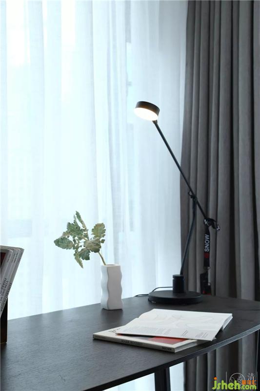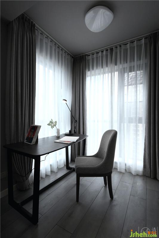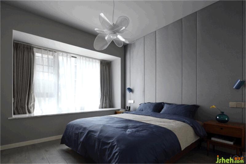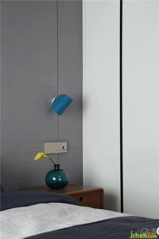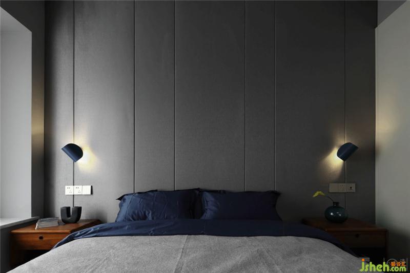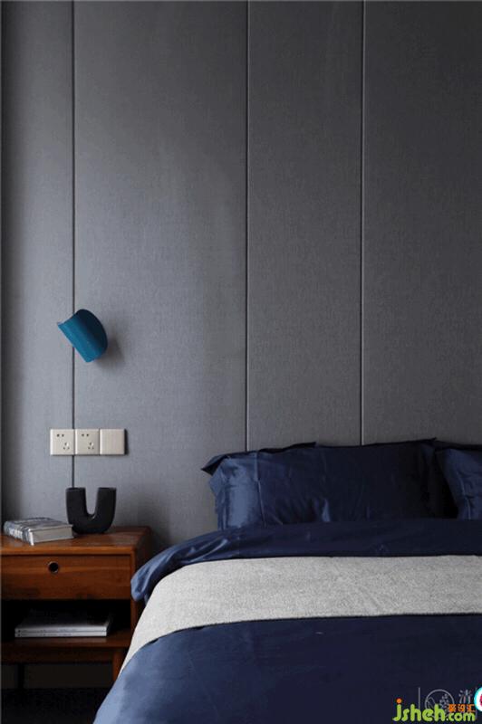 卧室,为了能更好的保证兔子的睡眠质量,我们舍弃了客厅的白色基调,运用了灰色调的墙面,再融合木质地板、灰色窗帘、蓝灰色色调的家纺用品、深棕色色调的床头柜作空间的配色,打破空间里的沉稳,丰富空间画面,增加居住舒适度。