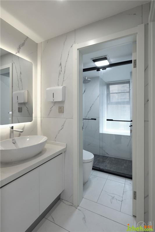 我们主要以纯净的白色墙面以及沉稳的黑色石材为空间底色,通过黑加白,空间在色彩的对比中,将各功能区划分分明。