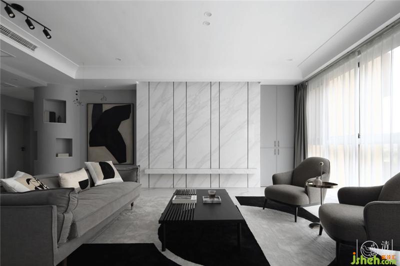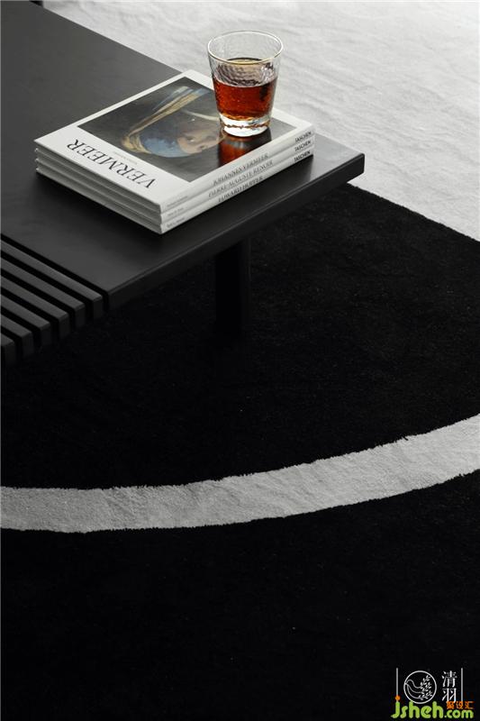 客厅中,采用布艺材质的灰色沙发、地毯和深色木质茶几,一深一浅、一硬一软,在材质、色彩、软硬的对比下,通过顶部照射下来的灯光和落地窗外的自然光,将空间内的沉稳、素雅打破,营造出温馨、舒适的生活氛围,彰显沫沫低调又俏皮的品味。