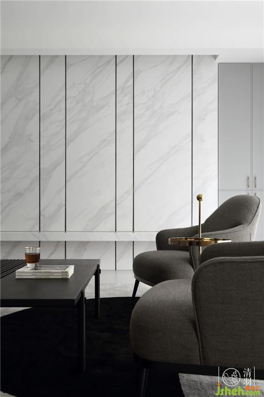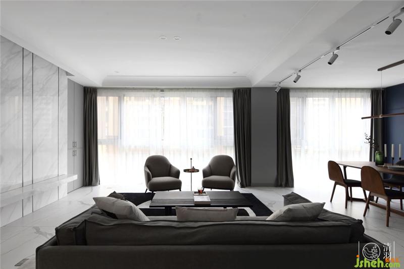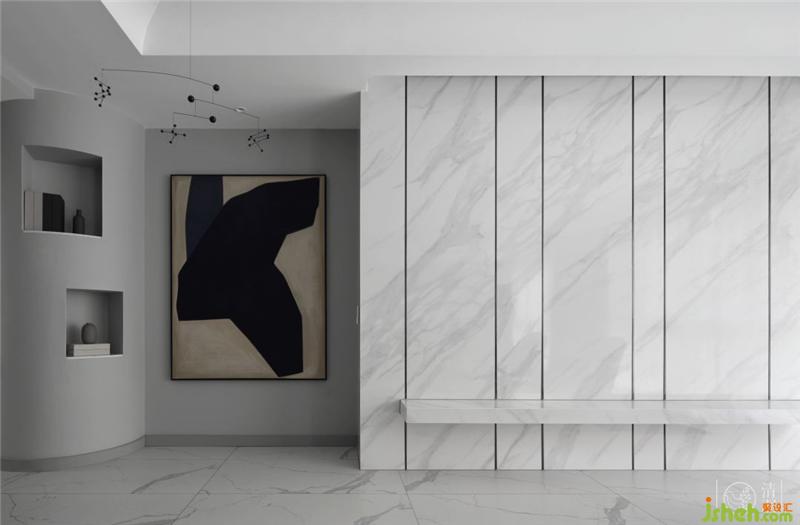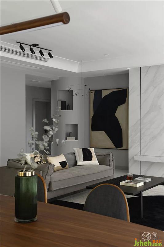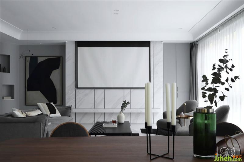 客厅与餐厅相互贯通,基于浅灰色系大色调不变的情况下,在布局上将原有的电视背景墙拆除替换成嵌入立面衣柜的设计,增加了主卧收纳面积的同时也利用衣柜背面做出了投影背景。
