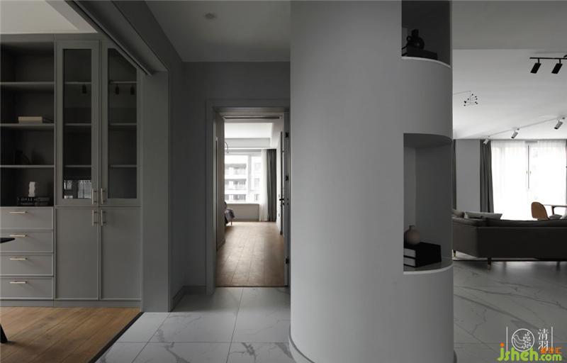 从玄关到客厅、餐厅区域,我们通过鞋柜替代实体墙的设计,玄关处两面浅灰色的L型鞋柜与餐厅西厨区的浅灰色柜体相连。将玄关与餐厅进行了功能上合理划分,也为沫沫的零食和藏酒,增加了更多储存的空间,玄关隔断也为全家打造出一个单独的入户玄关和独立的西厨区域,解决了屋主喜爱烘焙的爱好,在空间里增加了日常与孩子共同进行手工制作的互动空间,进一步增加了生活的乐趣。