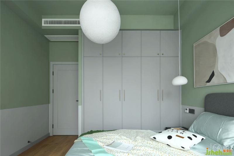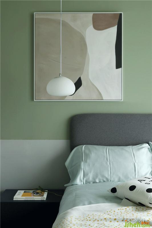 墙面我们采用浅绿灰色加白色的形式贯穿整个空间,延续整体的灰色衣柜、统一色调,再加上地板的木色、黄色抱枕,体现空间层次,让哥哥能在这个空间里可以安静的游戏、学习。