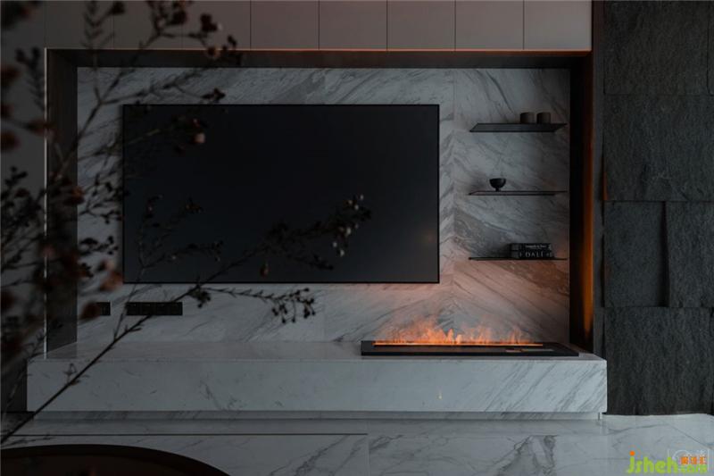 整个客厅空间,我们首先以大面积珍珠灰色的进口布料做沙发一侧及转角处墙面的硬包处理,同色系乳胶漆顶面,大规格石材纹路的地面大砖,延伸到电视背景墙的天然大理石背景,营造出简单大气的空间氛围。