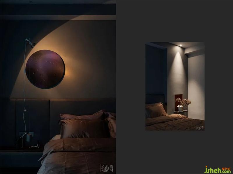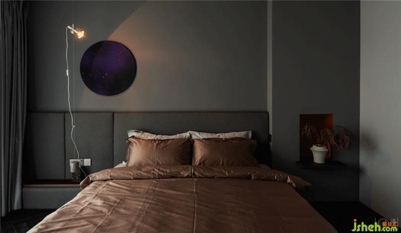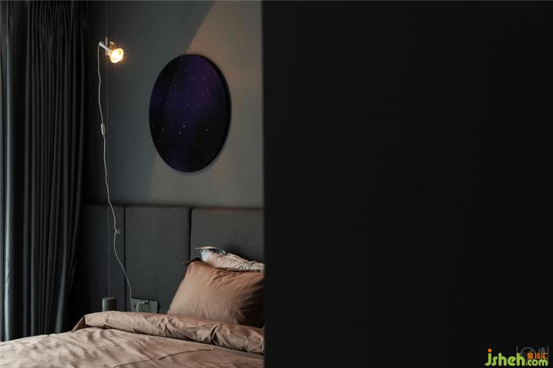 整体定制的床头与床箱配上德国原装的WULFF沃福床垫,预先嵌入墙体的置物板,可以装饰也可以置物的壁龛,能上下滑动、满足不同生活需求的瑞典Pholc Blend混凝土Led吊灯,以及一块星空艺术装置,一张柔软的白色地毯,就是为数不多的装饰了。