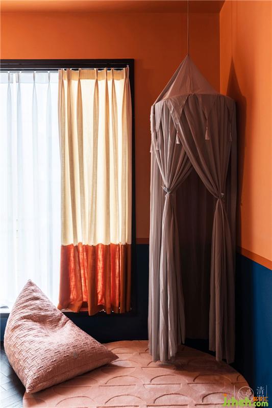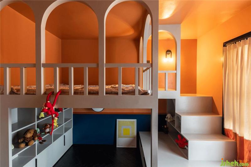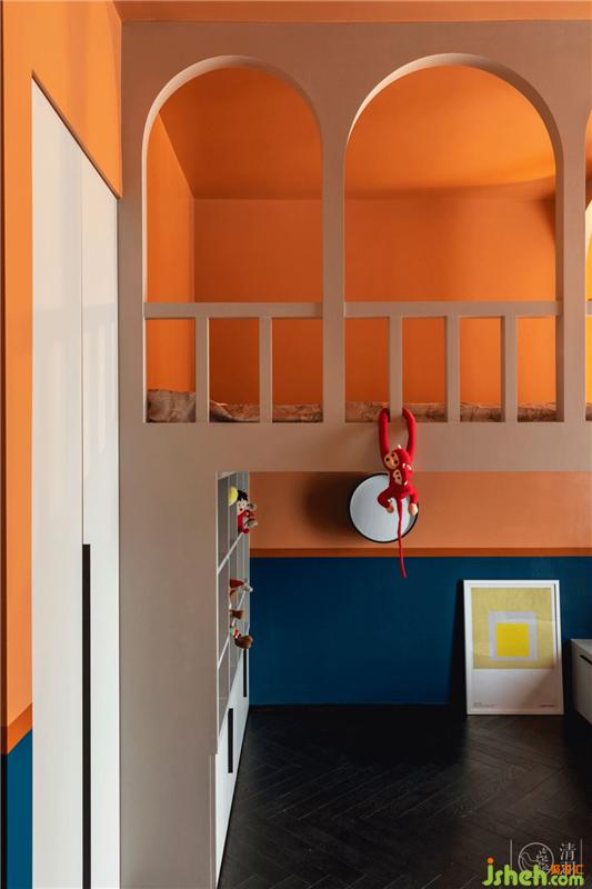 女儿房以橙蓝对比色营造出空间轻松明快的氛围,迷你的拱门围绕成床的围栏,又带出一点骑士堡既视感,希望小姐姐能在这里成长成一位勇敢的“公主”。