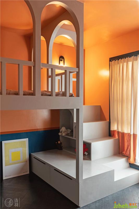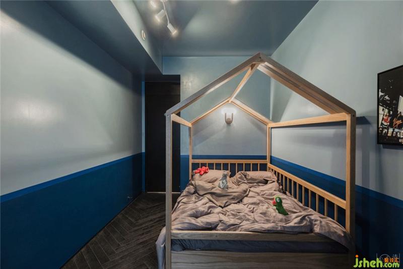 儿子因为年龄尚小,我们给他的房间里定制了一架颇具安全感的木屋框架造型床。