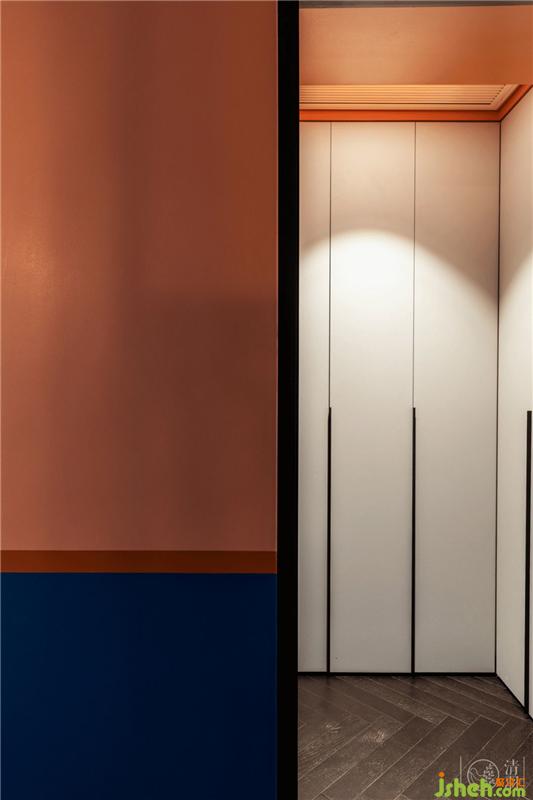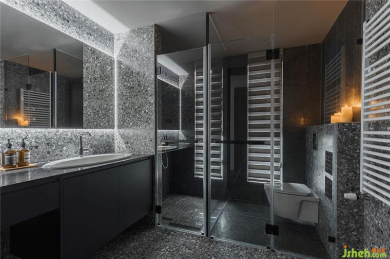 水磨石打造的灰色空间里,用镜子四周嵌入的灯带与玻璃门制造出高级的通透感。