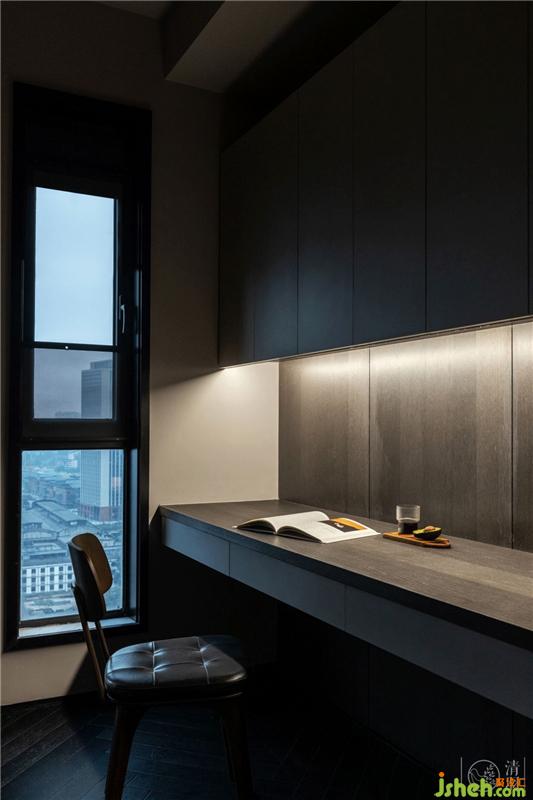 根据室内空间尺寸,现场制作了书柜、工作台与护墙板,以保证能严丝合缝的落地,线条能被排得绝对的整齐干净,书房的理性主义设计即刻显露。配一把同色系Stellar works椅子,替代台灯足够满足夜间阅读或办公需求的嵌入式灯带,其他的就留给书本和看书的人吧。