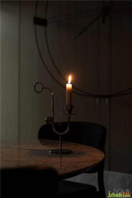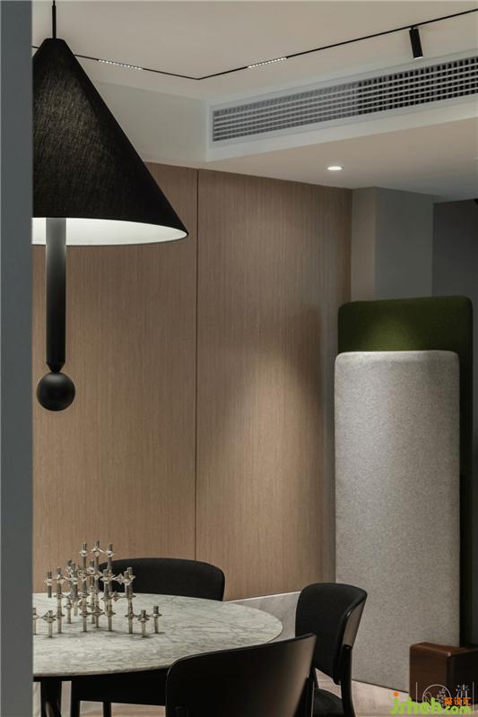 它的中心是餐桌,以及吊灯,我们希望在不打破空间色调平衡的前提下,让餐厅显得活泼一点。于是只能从家具灯饰上下手了。造型略显俏皮的原版Maison Dada吊灯,CAMERICH锐驰的圆形餐桌,恰好能够柔和主题空间里那些笔直线条带来的距离感。