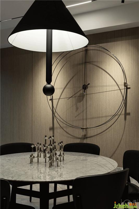 在餐厅上方装置了一圈磁吸灯,安装的射灯也可以随意调节位置和角度。黑色的灯轨与Nomon挂钟搭配起来也极其协调。