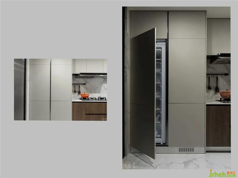 依然坚持“我们做好最基础的功能构建,其余的就交给优秀的主妇吧”这样的原则。足够丰满的储物空间,足够宽敞的操作空间与台面,嵌入式冰箱,把更多的空间留给女主人萨萨去创造更多美味的食物。