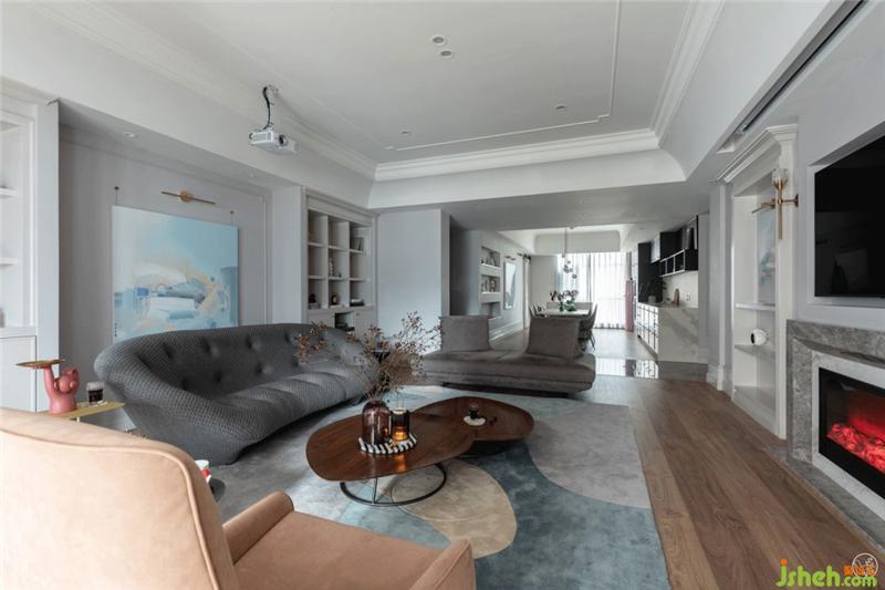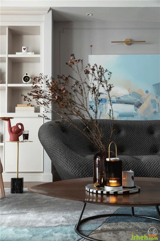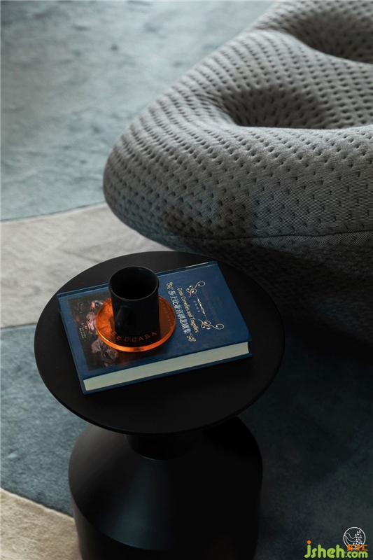 于是有意在选择地毯时,呼应油画的黄蓝色调,圆形色块的线条又和沙发的曲线达成一致。