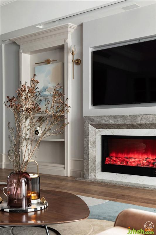 电视背景墙做了最简单的线条,勾勒出颇具仪式感又不会过于拘谨的氛围。电子壁炉是整个家的情感加热器,夜幕降临,一家人围坐在一起,重温一部经典动画,这就是最好的时光。