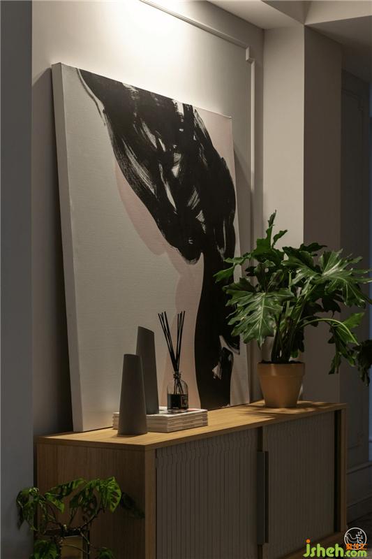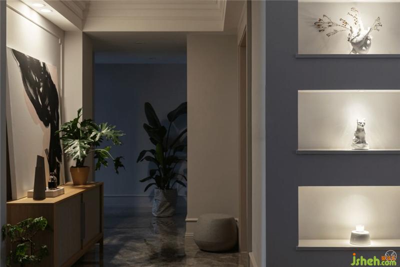 入户和走廊在整个户型上来看,比较流转,采光也不是很棒,于是我们干脆就利用建筑上的这一缺陷,制造出空间上含蓄、清幽的气质。