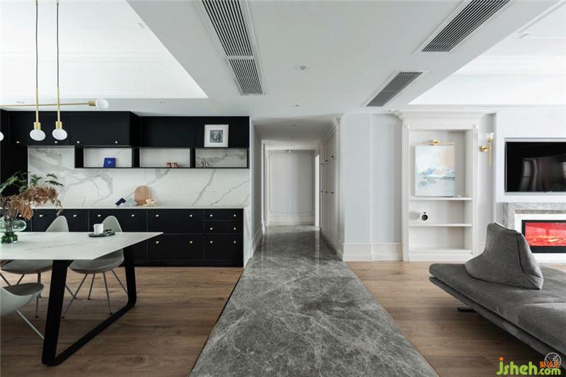 餐厅、走廊和客厅通过胡桃木地板、炭灰色大理石瓷砖来做最干净利落的空间区分,极致简约。