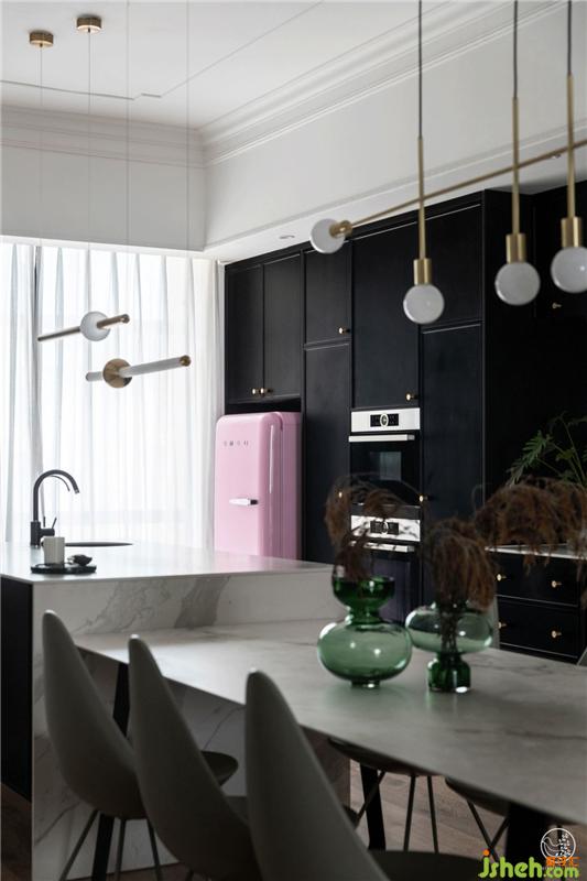 粉色的Smeg复古冰箱是女主人宝宝最开始就想放进西厨空间的,为整个空间调和出一丝俏皮而甜美的趣味感,兼具实用和装饰性,在色彩也与客厅的单人位沙发产生了呼应。