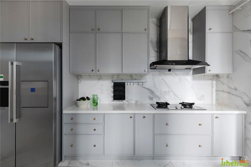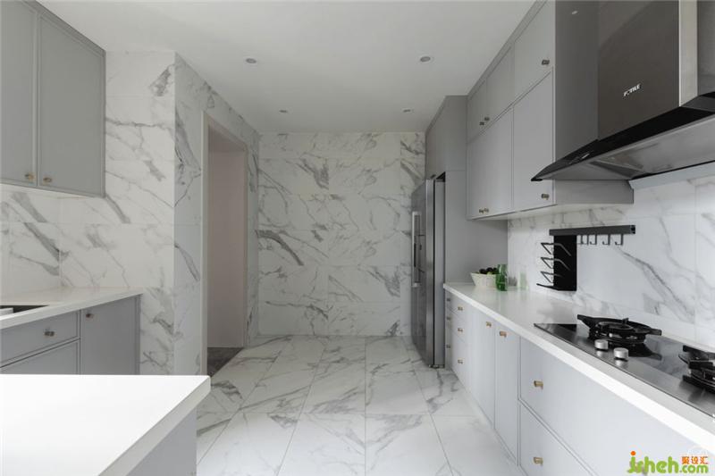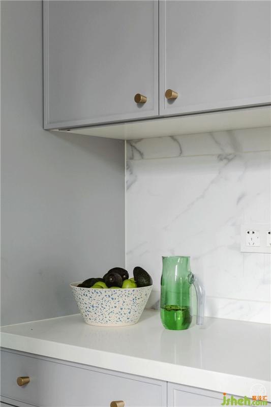 洁净温柔是它的基调,淡雅的大理石纹如同湛蓝天空中丝丝飘荡的云,浅灰色的橱柜除了得心应手地满足了收纳,还散发着最素净的质感。