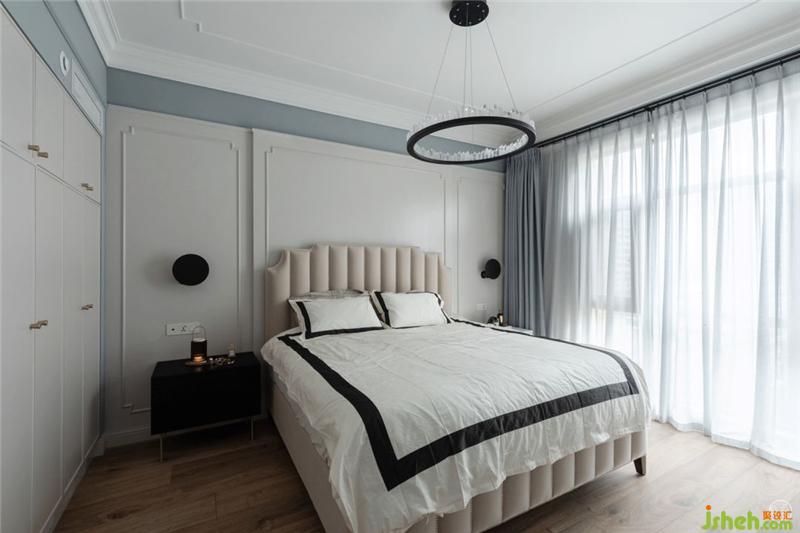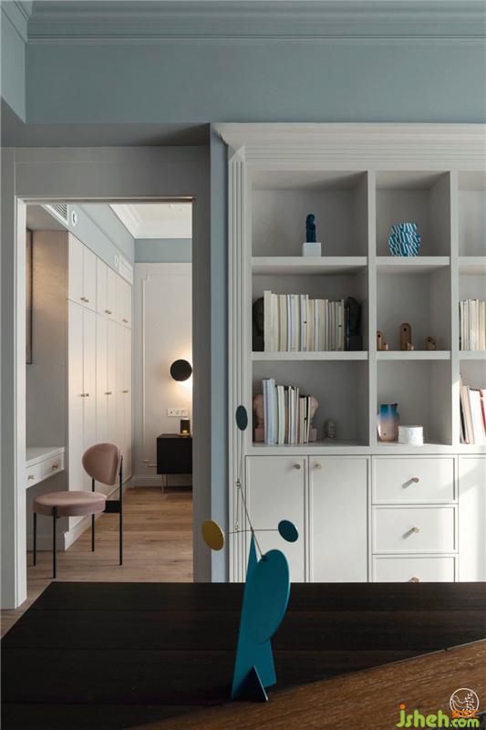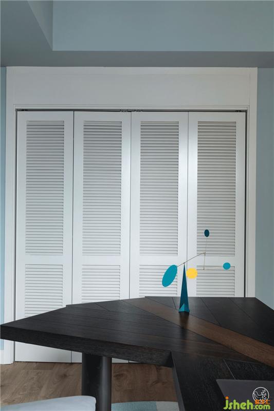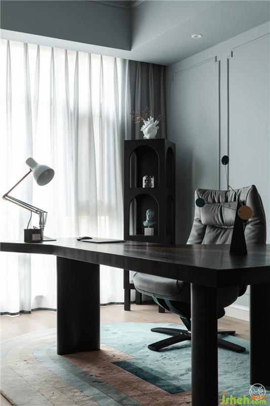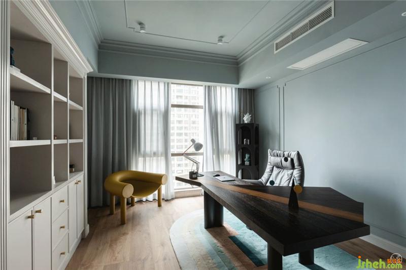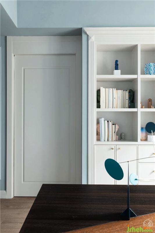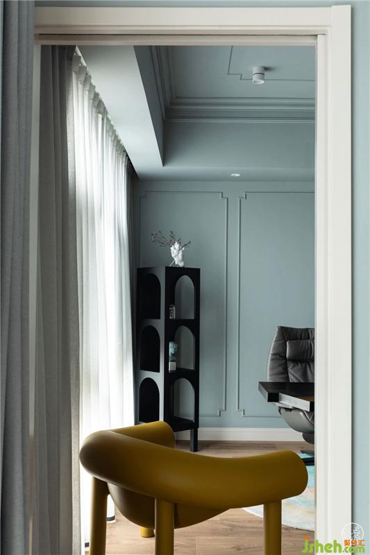 主色调是能让人快速感到平静安宁的,海边天空的浅灰蓝,墙面呼应客厅做了最简单线条勾勒,毕竟看书或办公都多少需要一些仪式感的。室内设计师
