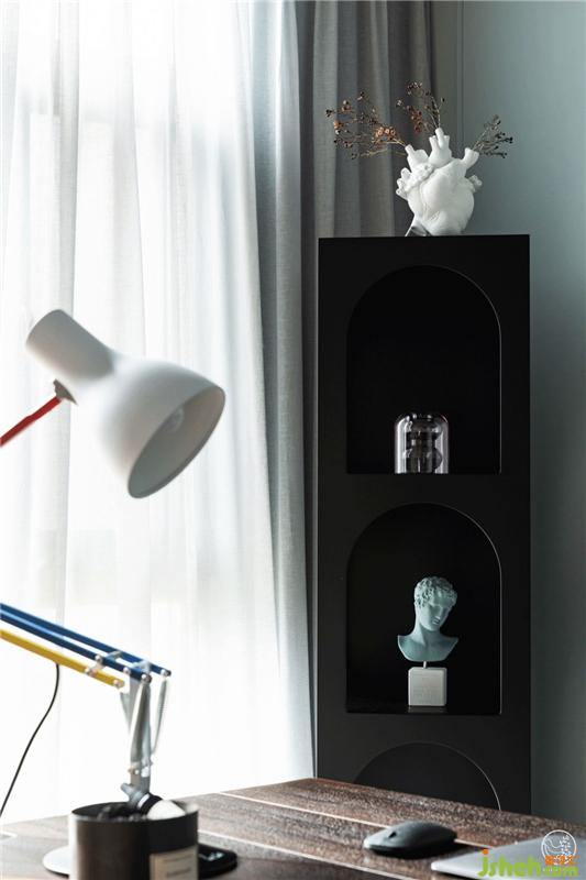 转角的黑色立柜是三角形的,有效利用空间的同时,又很有设计感,拱形展示橱窗很有复古气息,刚刚好安放屋主的艺术装饰品。