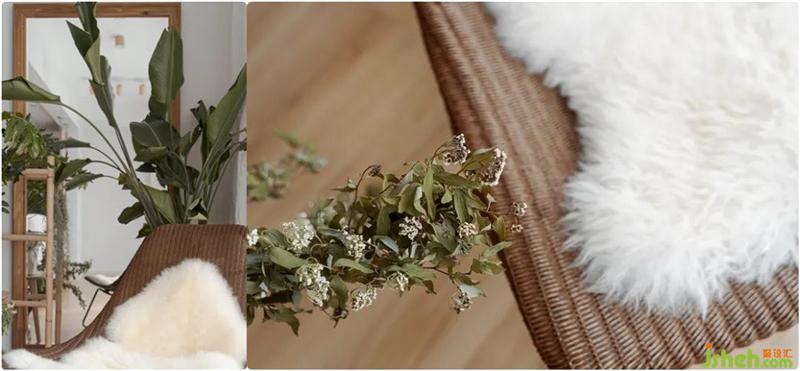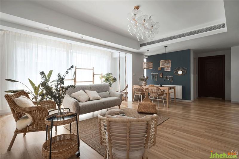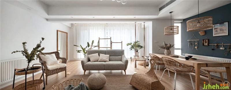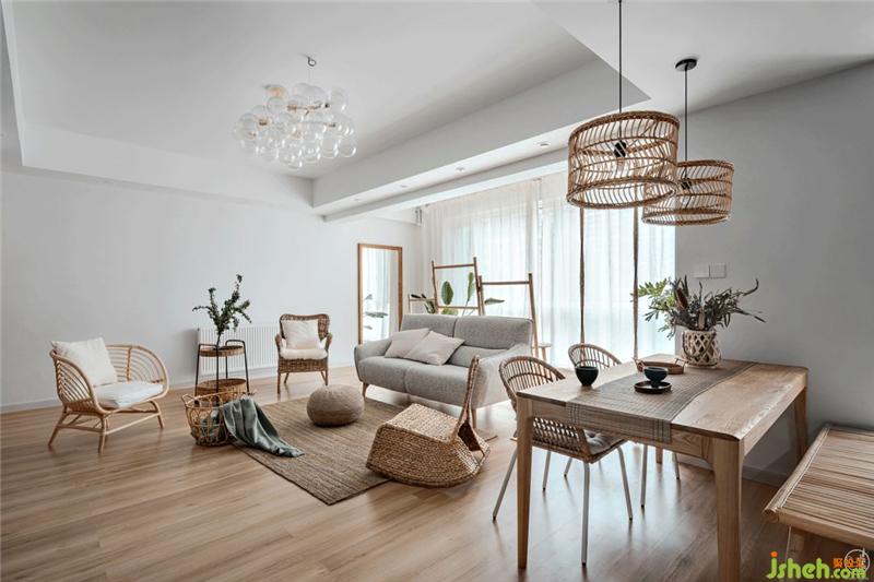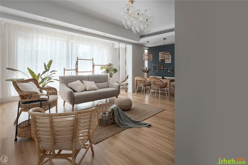 在这个符合功能的空间里,我们以原木色的地板、餐桌,竹木编织的藤编灯罩、座椅、置物架、小饰品,草编的褐灰色地毯,浅灰色的棉麻沙发、秋千吊椅,划分出了就餐区域、活动休闲以及亲子区域。