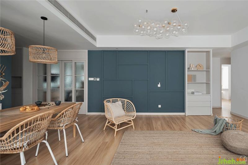 白色的落地窗纱以及一面蓝灰色的背景墙,营造出整个空间清新有不失层次感的色彩基调。