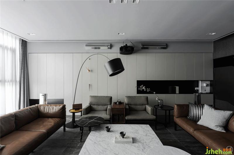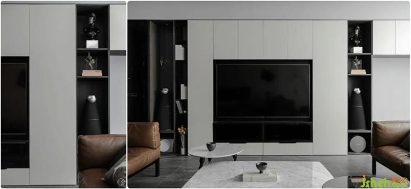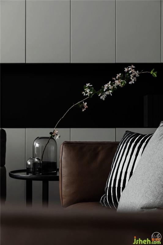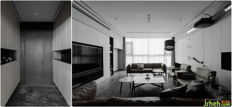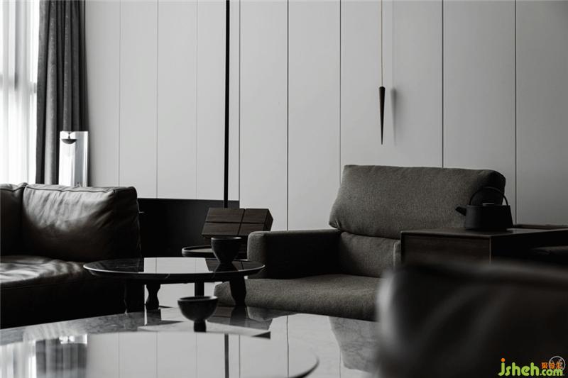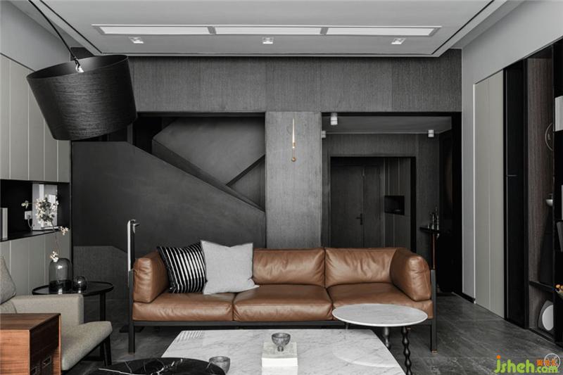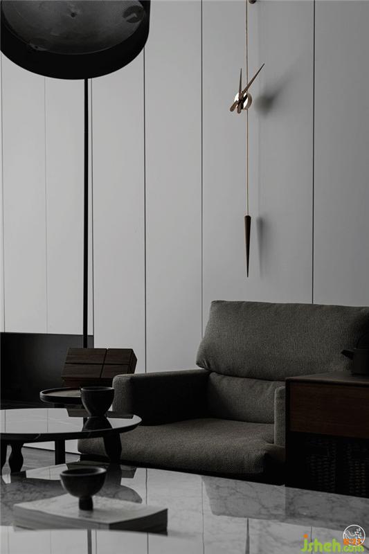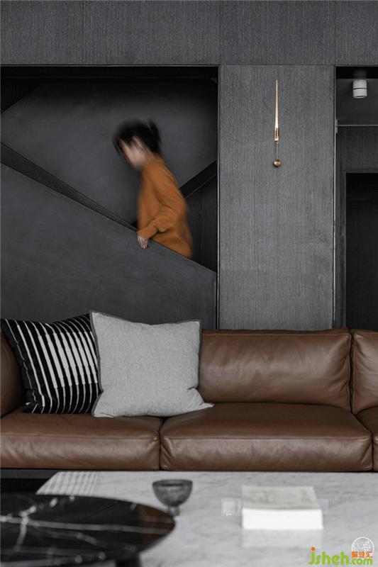我们将从玄关开始直到整个客厅的两侧墙面做成收纳柜,外观看来则是最简单的平行垂直线条。同时去掉客厅的个性化、主题化表达,只用沙发、茶几、电视来具象出它的功能。如此一来,这个由不同明度的灰色为基调辅以黑色、棕色点缀出层次感的空间,就显得更为客观,任何身处其中的使用者都不会被束缚。别墅装饰
