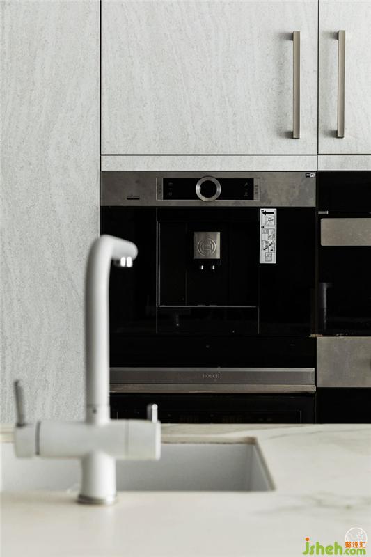 餐厅、厨房在负一层,因此我们有充足的空间去打造一个品质感极佳,且能满足二孩家庭多人、多功能操作需求的餐厨空间。