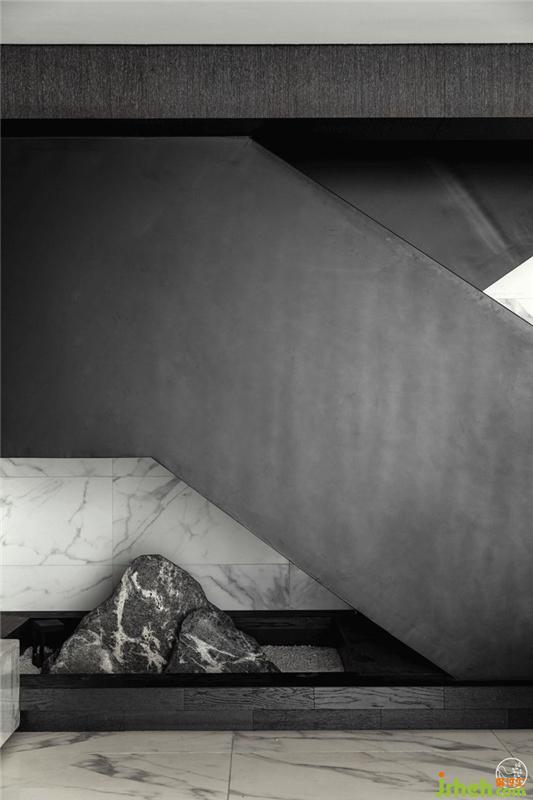 黑色全钢板扶手,搭配拥有天然纹理的石材梯步,至下是人间烟火,至上则好似能够通往无限的宇宙。
