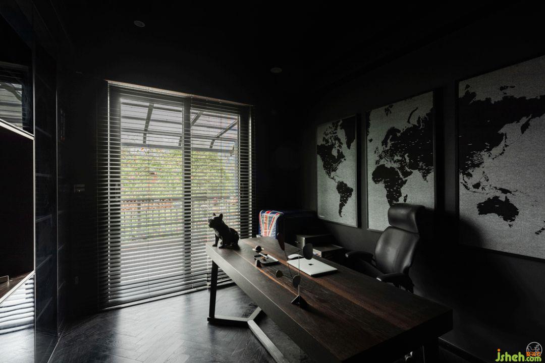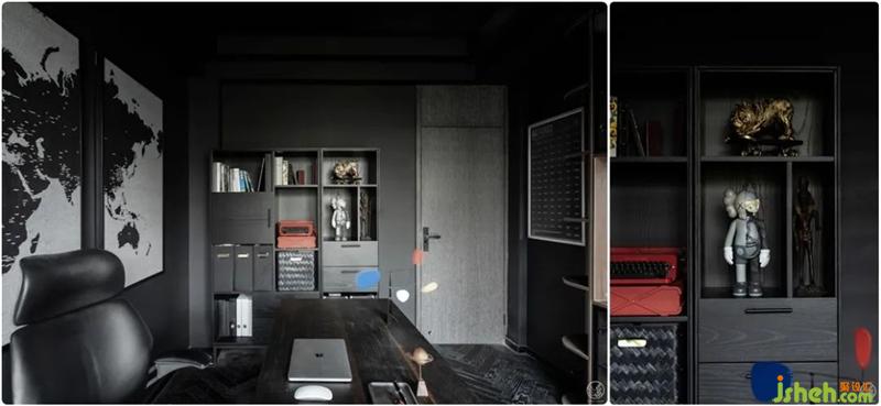书房是这一层的另一个重点。某种程度上这里更专属于男主人,我们为逃不过真香定律的他定制了展示柜,世界地图的背景似乎也暗示了世界好物都将汇聚于此。